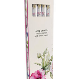 Set van 6 met kleurrijke kunst bedrukte HB potloden in kartonnen doosje, inclusief gum Lengte 19 cm Doorsnede 0,5 cm