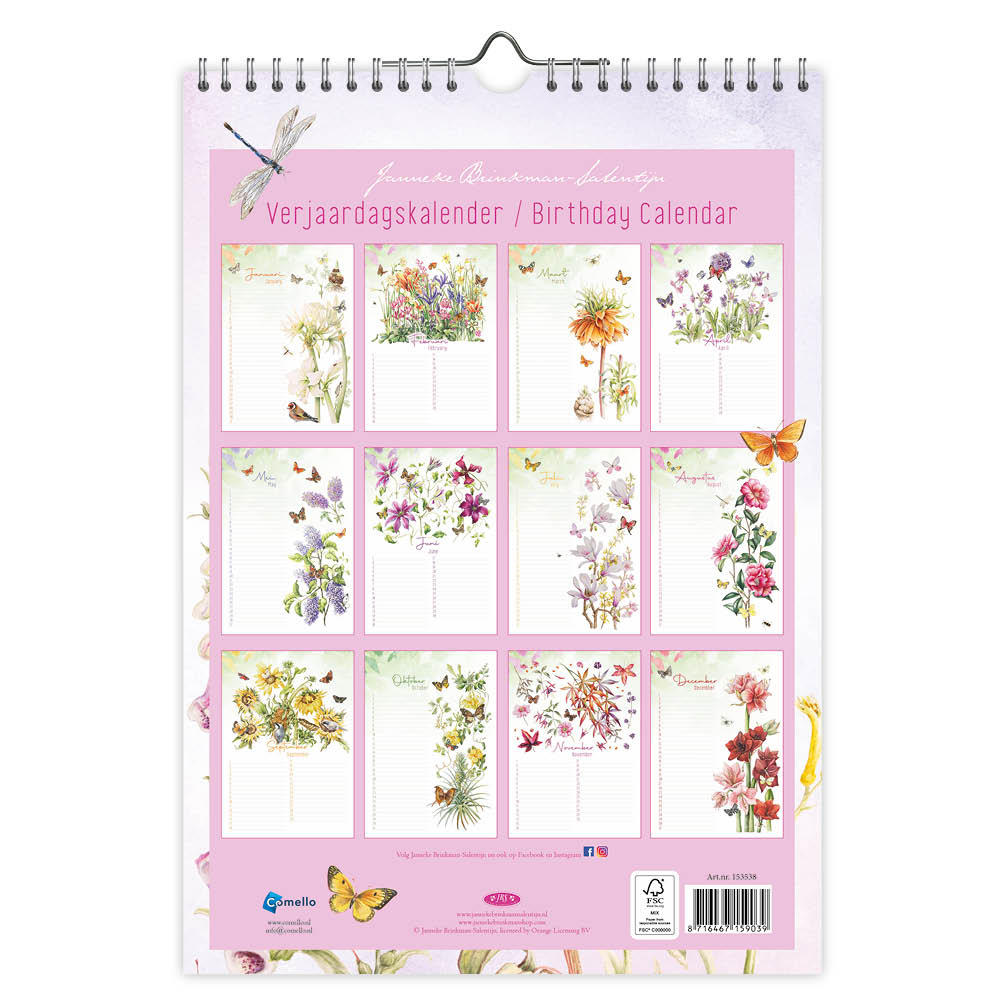 Deze stijlvol vormgegeven verjaardagskalender van Janneke Brinkman-Salentijn bevat elke maand een prachtige tekening van de botanische natuur. Al bijna 30 jaar maakt zij iedere maand een nieuwe aquarel van bloemen die haar op dat moment inspireren. Door de ringband is de kalender bovendien makkelijk op te hangen. Formaat: 30 x 21 cm